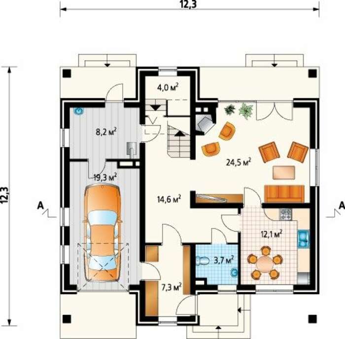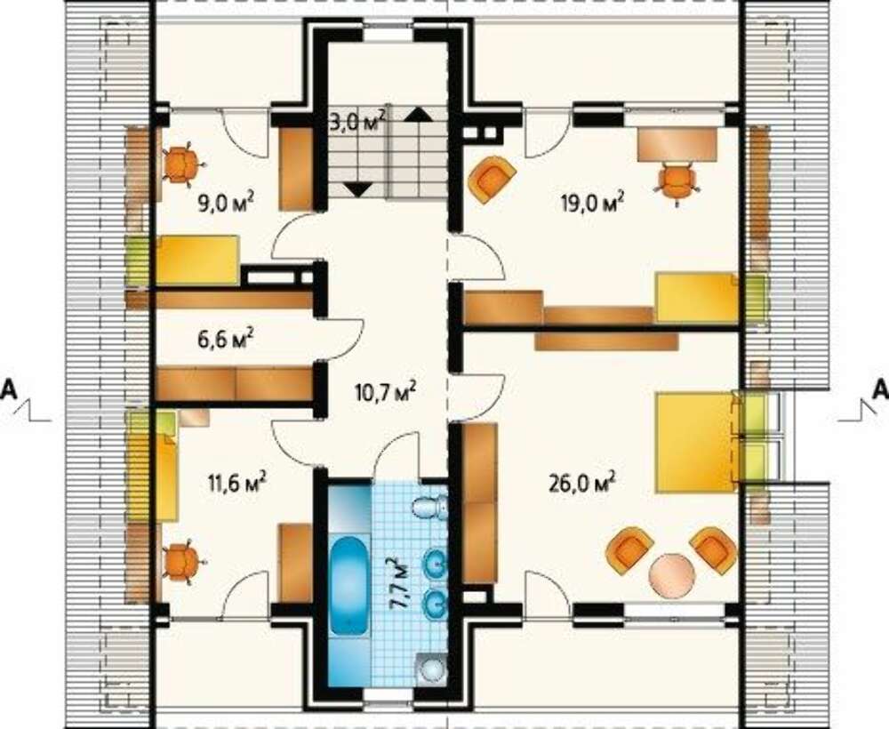 • план первого и остальных этажей – показывает размещение отдельных помещений и их размеры, площадь, размещение стен, размещение дверных и оконных проемов, кухонных и санитарных установок;