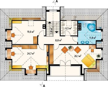 • разрезы - показывают все элементы здания после разреза вдоль и поперек от конька крыши до фундаментов, т.е. слои пола, перекрытий и кровли;