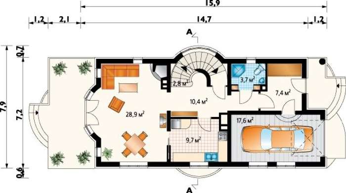 • разрезы - показывают все элементы здания после разреза вдоль и поперек от конька крыши до фундаментов, т.е. слои пола, перекрытий и кровли;