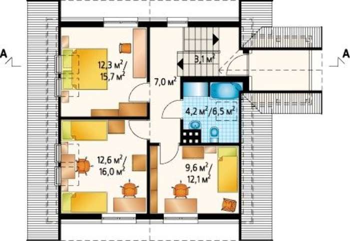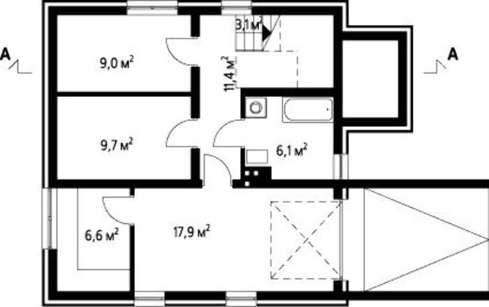 • план первого и остальных этажей – показывает размещение отдельных помещений и их размеры, площадь, размещение стен, размещение дверных и оконных проемов, кухонных и санитарных установок;