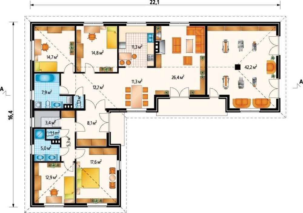 • план первого и остальных этажей – показывает размещение отдельных помещений и их размеры, площадь, размещение стен, размещение дверных и оконных проемов, кухонных и санитарных установок;