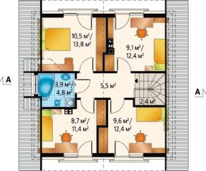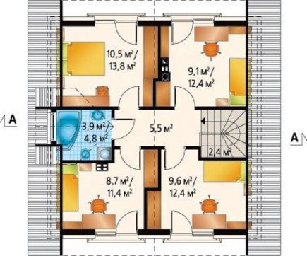 • план первого и остальных этажей – показывает размещение отдельных помещений и их размеры, площадь, размещение стен, размещение дверных и оконных проемов, кухонных и санитарных установок;