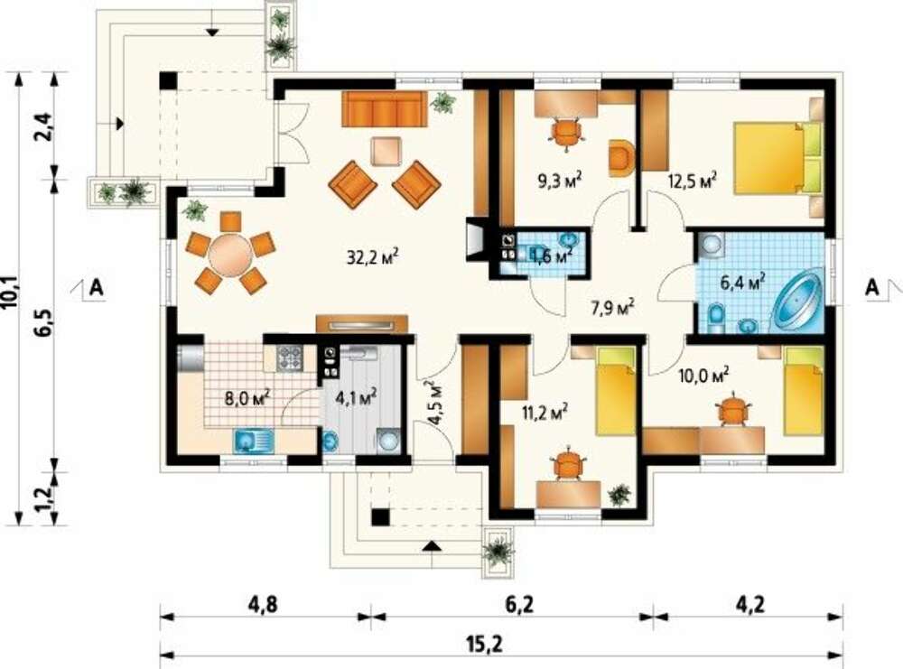 • план первого и остальных этажей – показывает размещение отдельных помещений и их размеры, площадь, размещение стен, размещение дверных и оконных проемов, кухонных и санитарных установок;