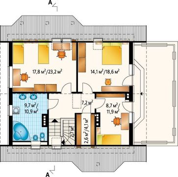 • план первого и остальных этажей – показывает размещение отдельных помещений и их размеры, площадь, размещение стен, размещение дверных и оконных проемов, кухонных и санитарных установок;