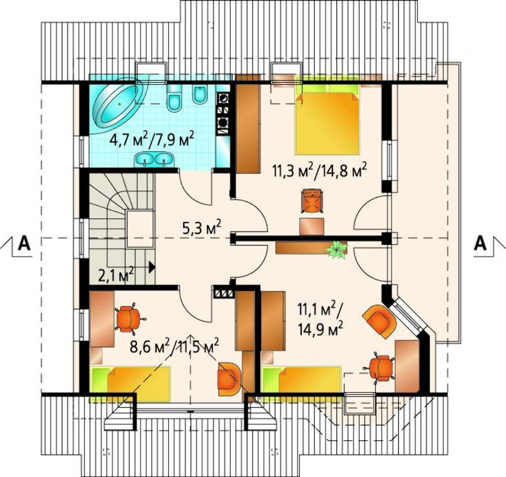 • план первого и остальных этажей – показывает размещение отдельных помещений и их размеры, площадь, размещение стен, размещение дверных и оконных проемов, кухонных и санитарных установок;