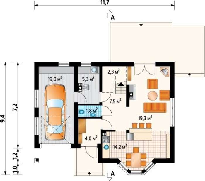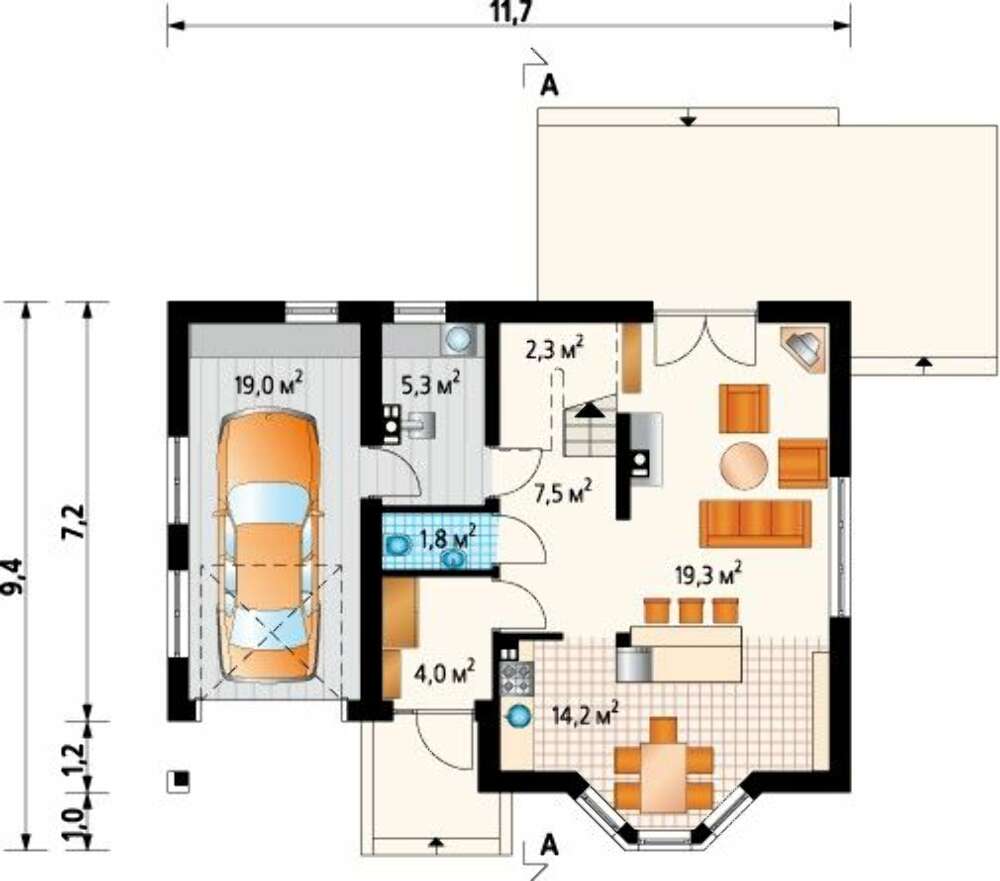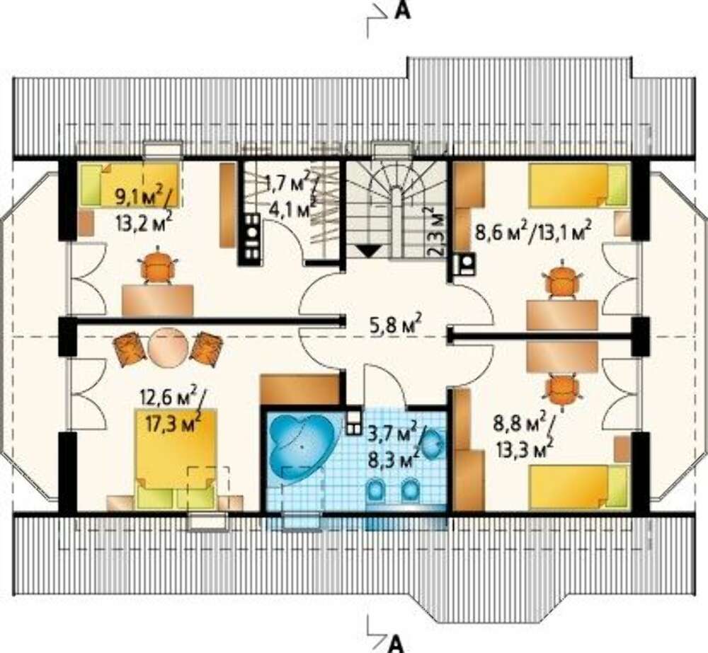 Проект привлекательного мансардного коттеджа с эркером в кухне-студио