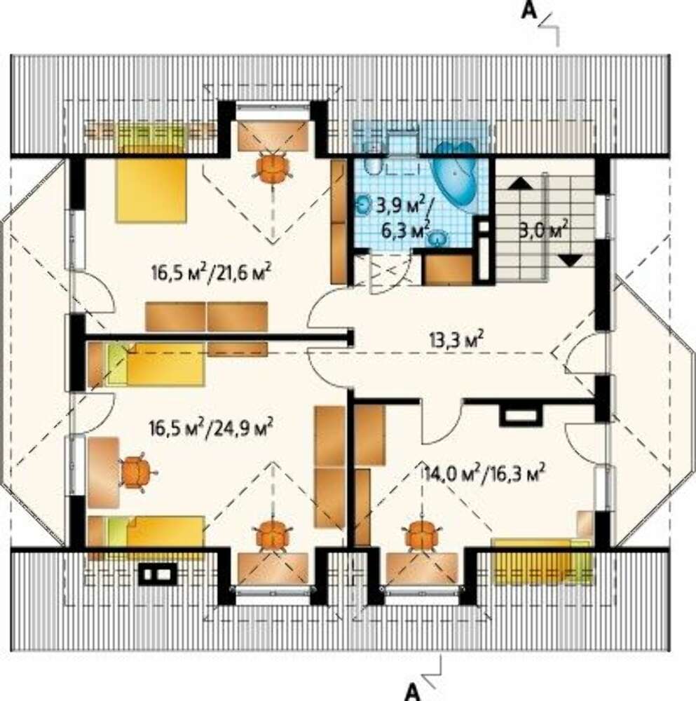 • план первого и остальных этажей – показывает размещение отдельных помещений и их размеры, площадь, размещение стен, размещение дверных и оконных проемов, кухонных и санитарных установок;