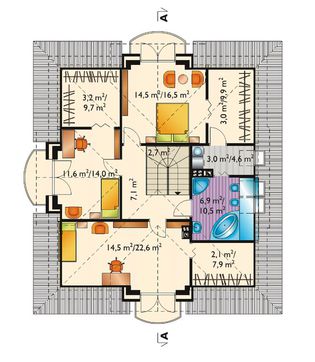 • разрезы - показывают все элементы здания после разреза вдоль и поперек от конька крыши до фундаментов, т.е. слои пола, перекрытий и кровли;