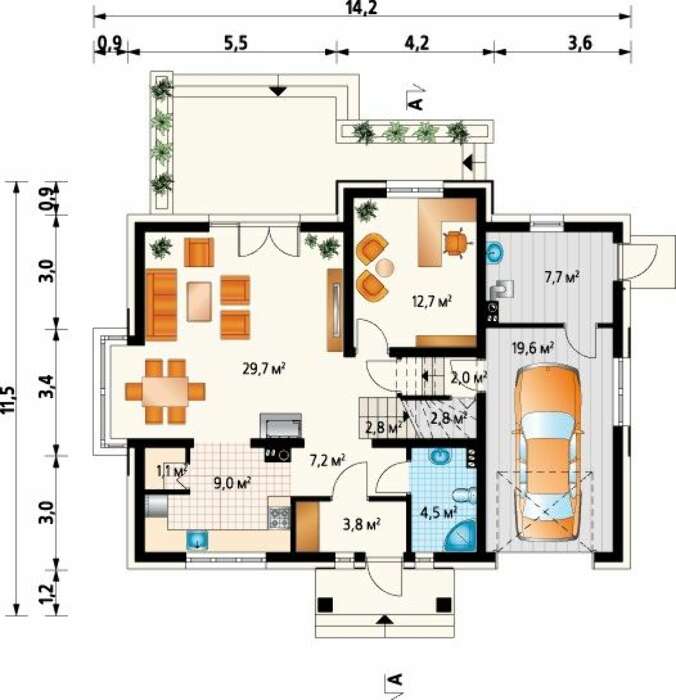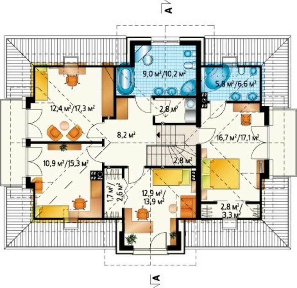 • план первого и остальных этажей – показывает размещение отдельных помещений и их размеры, площадь, размещение стен, размещение дверных и оконных проемов, кухонных и санитарных установок;